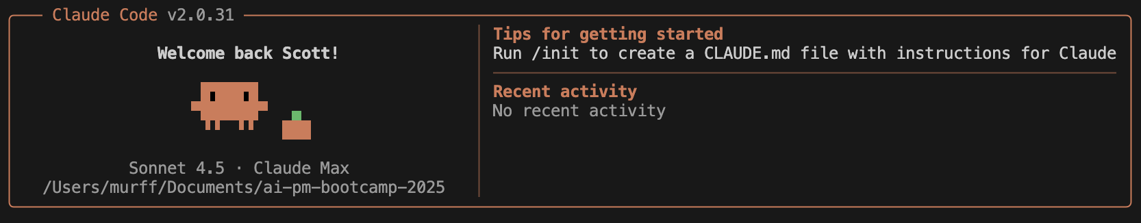 curl -fsSL https://claude.ai/install.sh | bashclaude --version2.0.31 (Claude Code)claudeYou will be prompted to authenticate that you have a Claude Pro account and will routed to a web-brower tab where you will sign into Claude. Once complete, return to VS Code and you should see something like: