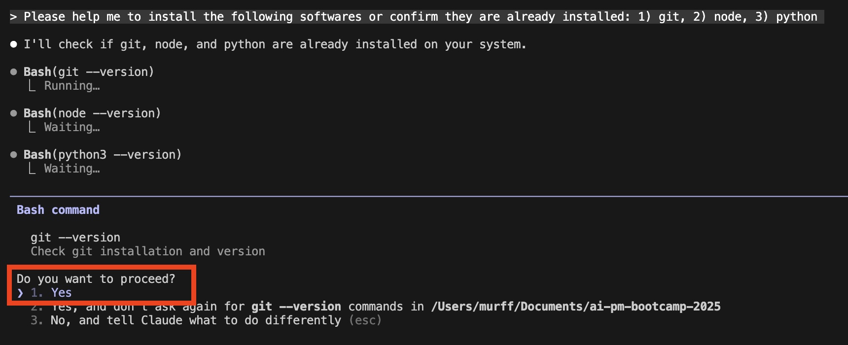Press Enter to say “Yes” when asked to proceed. Claude Code functions basically like a normal chat bot and will make the remaining installations with your approval.