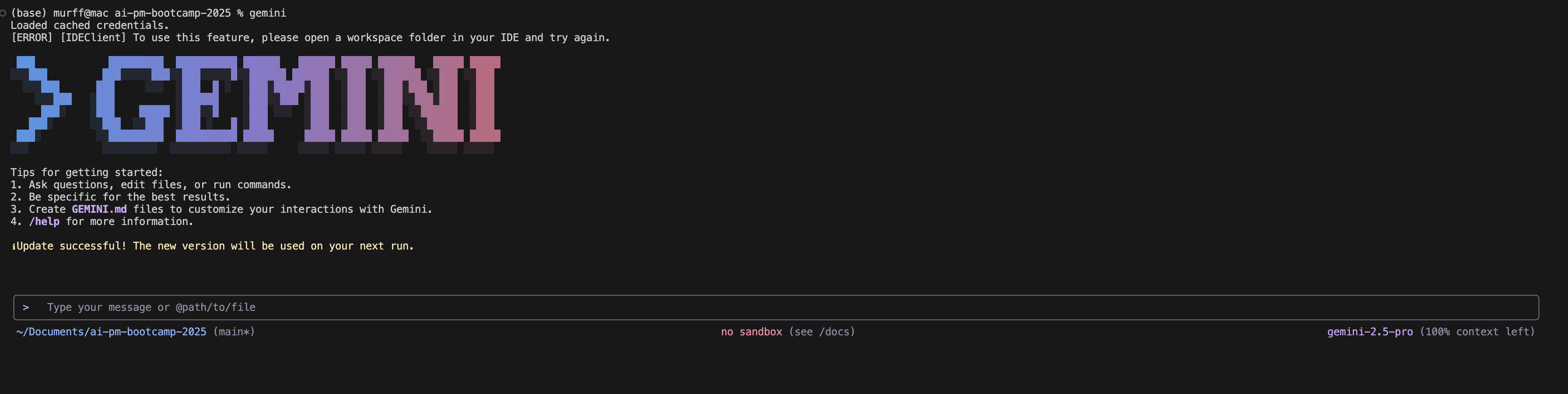 You should see something like:PS C:\Users\YourName> ← Windows or yourname@MacBook-Pro ~ % ← macOS
