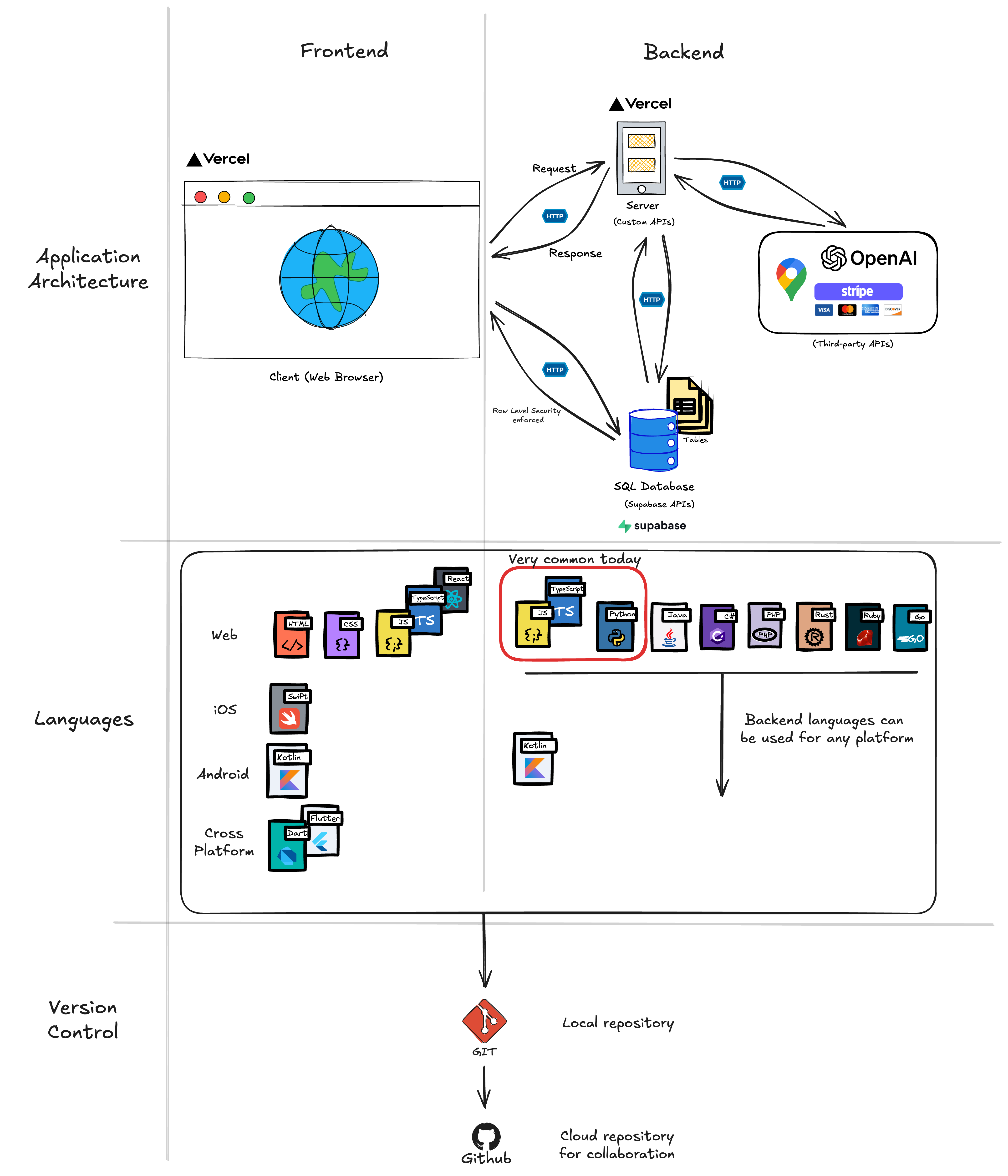 The backend consists of everything the user does not directly see. It handles the “business logic” which are the rules and operations that make your app work. When you submit a login form, the backend checks if your password is correct. When you add a to-do item, the backend validates it and saves it.