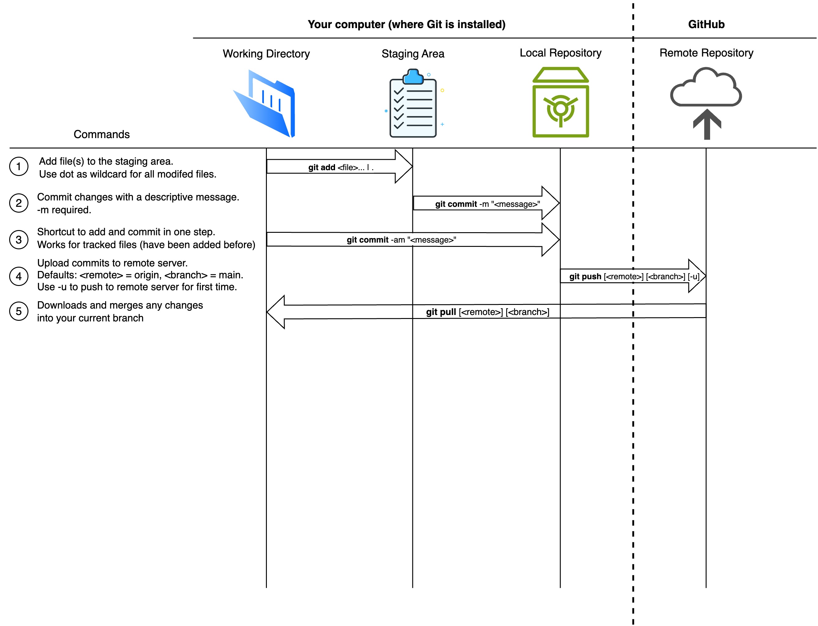 A typical workflow in git consists of editing files in your working directory, staging them, which just means listing which ones you want to save, saving or committing them and lastly, pushing them to a remote cloud hosted folder (called a respository) for others to use.